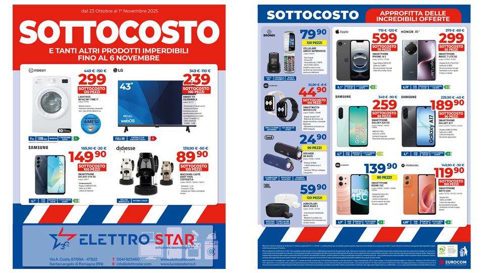 Elettro Star lancia il Sottocosto più atteso dell’autunno 2025, valido dal 23 Ottobre all’1 Novembre 2025 (con alcune offerte prolungate fino al 6 Novembre) presso il negozio di Santarcangelo di Romagna (RN).
